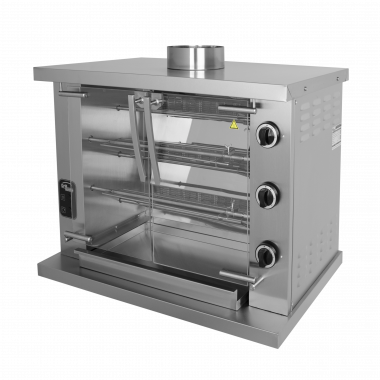 Рамная конструкция, цепная передача вращения шампуров, полный газ.контроль.Гриль на 15 тушек (масса тушки 1,2 кг), 3 шампура в первом ряду+2 шампур во втором ряду, выполнен полностью из нержавеющей стали, готовит курицу за 55 минут