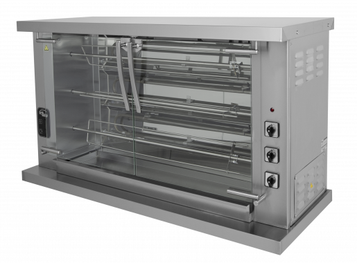 Гриль на 15 тушек, 3 шампура в один ряд, выполнен полностью из нержавеющей стали, готовит курицу за 55 минут