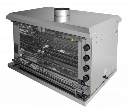 Гриль карусельный газовый на 30 тушек (масса тушки 1,2 кг), 5 люлек (корзин для курицы и субпродуктов, 4 горелки с системой газ-контроль, 4 регулирующих крана, передние дверцы из закаленного стекла, задняя стенка - полностью из закаленного стекла, в камере подсветка, выполнен полностью из нержавеющей стали, газовая мощность 16.8 кВт.