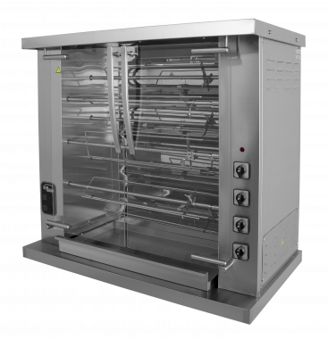 Гриль на 21 тушек, 4 шампура в первом ряду+3 шампура во втором ряду, выполнен полностью из нержавеющей стали, готовит курицу за 55 минут