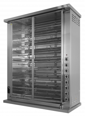 Гриль на 75 тушек, 8 шампуров в первом ряду+7 шампуров во втором ряду, выполнен полностью из нержавеющей стали, готовит курицу за 55 минут