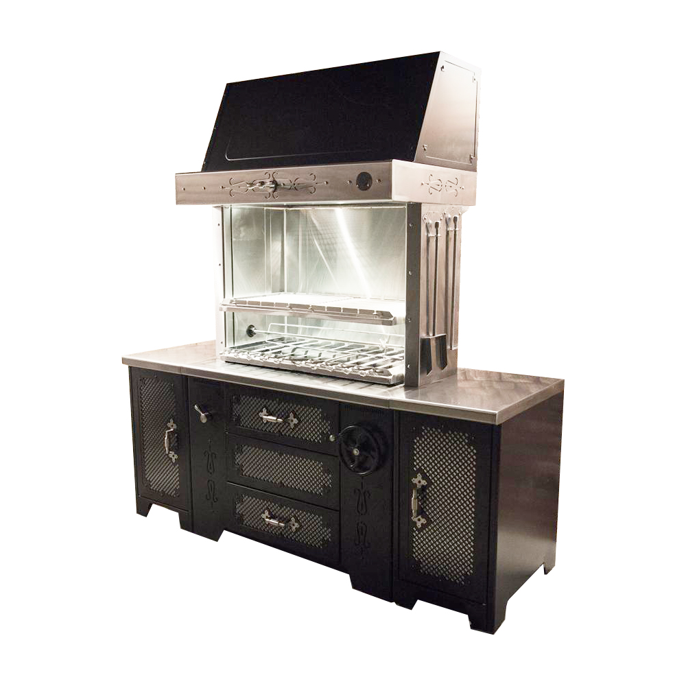 Винтажный стиль, полностью из нержавеющей стали, некоторые элементы мангала могут быть покрыты спец. покрытием (цвет по желанию заказчика), 2 уровня для расположения платфом для сеток и шампуров, сетка для жарки стейков/рыбы/шашлыка с механическим приводом (регулировка по вертикали), центральный шампур из нержавеющей стали для жарки курицы, барашка, поросенка, кабана с электрическим приводом (литая поворотная ручка в винтажном стиле) и механической, плавной регулировкой шампура по вертикали, выдвижной отсек для золы, регилируемая вытяжка, задний фартук мангала, яркая подсветка зоны приготовления, 2 тумбы из нержавеющей стали с открывающимися дверями ( 1 полка в каждой тумбе), габаритные размеры 2080х730х1870, масса 200 кг, габариты брутто - 4 мес та мангал, вытяжка, 2 тумбы 2770х830х1900, комплект поставки: мангал, 1 шампур для птицы, 1 шампур для барашка, 2 решетки-сетки из н/стали для стейков/рыбы, 10 шампуров для шашлыка, задний фартук мангала, подсветка, 2 тумбы кочерга и лопата для углей, эквивалентная мощность 39 кВт; г. Брутто 2 места: 1-вытяжка 86,6кг, 850х1250х820мм, 2-манагал 332кг, 1870х1320х980мм